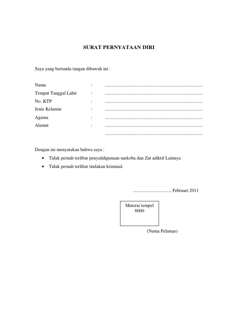 Surat pernyataan adalah surat yang dibuat untuk menyatakan bahwa seseorang telah atau tidak surat pengunduran diri terdiri dari beberapa macam, tergantung tujuan dari penulis itu sendiri. Surat ini biasanya dibuat oleh seorang calon karyawan untuk perusahaan. Contoh surat pernyataan akan membantumu untuk menemukan referensi yang tepat sebelum menulisnya dengan tujuan tertentu. Surat ini digunakan ketika si pembuat ingin menjelaskan atau menegaskan sesuatu hal yang ada di dalam dirinya kepada pihak penerima. Sebelum masuk ke contoh surat pernyataan ada baiknya kita pahami sedikit tentang surat pernyataan itu sendiri. Ada banyak sekali ragam contoh surat pernyataan yang bisa anda jadikan referensi di sini. #surat pernyataan diri 2021 | adakalanya suatu instansi atau perusahaan tempat kita bekerja meminta kita untuk membuat pernyataan diri sendiri. Sebab berbeda keperluan dan juga berbeda surat pernyataan, bahkan pemberi pernyataan juga akan berbeda. Contoh surat pernyataan diri dan tips membuatnya dengan baik, surat pernyataan diri kesehatan, menikah, menjual barang, surat peryataan diri hukum, kriminal dan masih banyak lagi akan admin bahas kali ini. Seperti apa contoh surat pernyataan yang benar? Apakah surat pernyataan ini harus bermaterai? Saya yang bertanda tangan di bawah ini Surat pernyataan diri merupakan surat yang berisi penjelasan identitas seseorang beserta pernyataan yang perlu diketahui orang atau pihak lain mengenai hal yang berkaitan dengan kondisi diri sendiri.